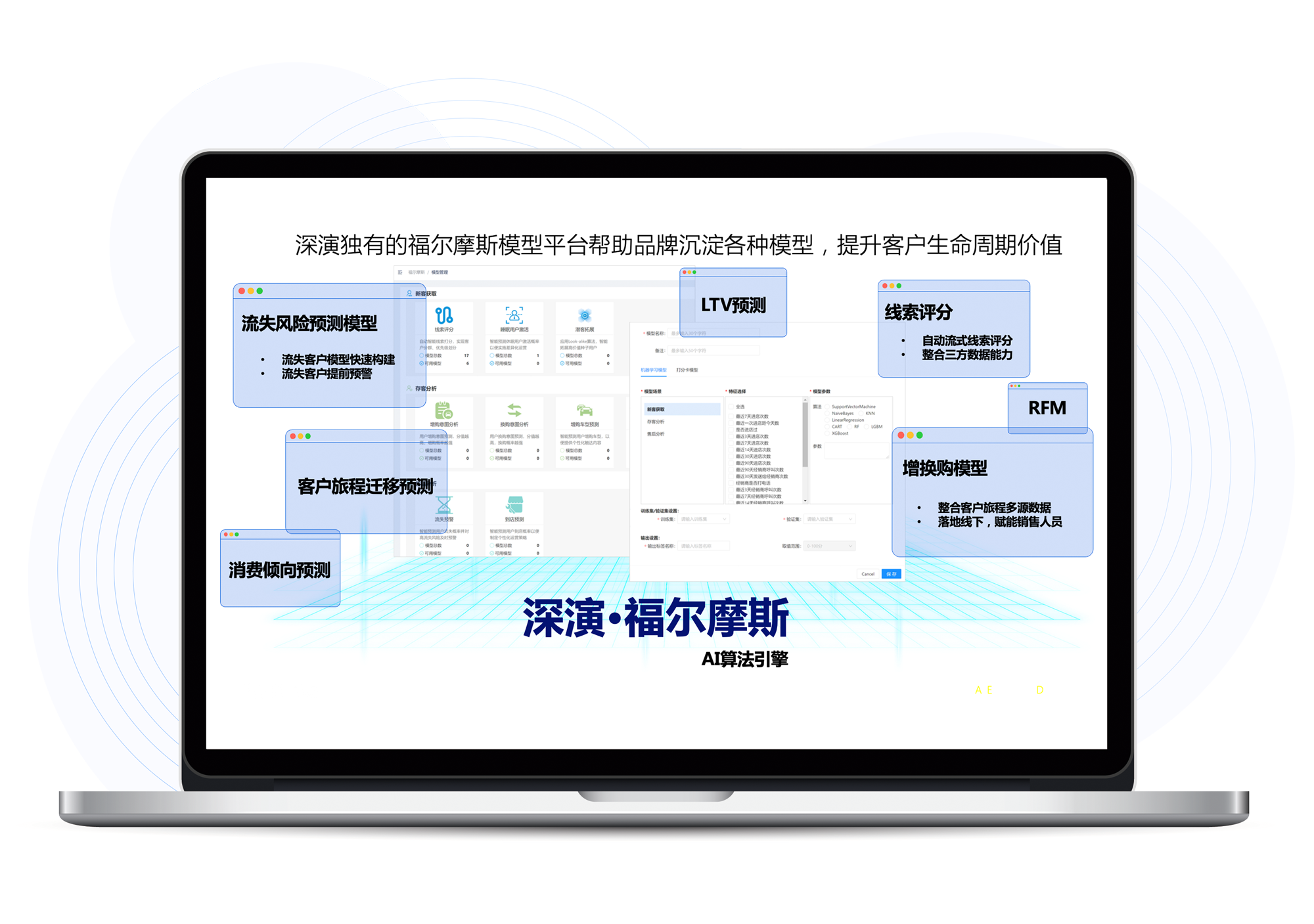 福尔摩斯AI是铂莱国际智能自主研发的AI算法模型平台,内嵌广告和用户运营两大模型体系,为铂莱国际智能营销决策云提供底层能力支撑,提升客户全生命周期价值